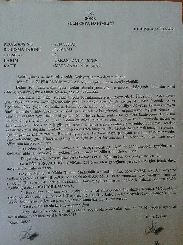 Aydın Valiliği İl Kültür Turizm Müdürlüğü tarafından doğa yürüyüşlerinde Tursab kanunun geçerli olması ve profesyonel kokartlı rehber bulundurulması konusundaki ısrarı ile açtığı ilk dava 2015 yılı mayıs ayında sonuçlanmıştı, açılan para cezası kaldırılmış ve ayrıca avukat masrafları da idareye yüklenmişti. İlgili kararı emsal davalar açılması halinde kullanmanız amacı ile tekrar bilginize sunuyoruz.