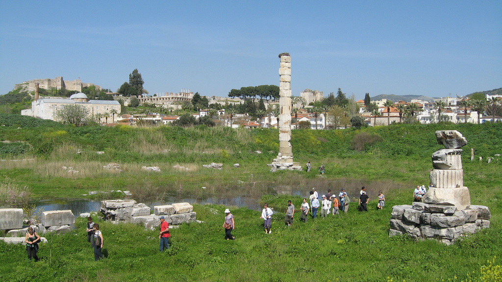 Mandalina bahçeleri arasında tatlı bir esinti eşliğinde ilerlerken bizi dere üzerinden Selçuk Mezarlığına taşıyacak metal köprüye ulaşıyoruz. Selçuk Mezarlığının içinden geçip çıkışta bulunan Şehitliği ziyaret ediyoruz. ilçemizin şehitlerini birkez daha anarken aziz hatıraları önünde saygı ile eğiliyoruz. Daha sonra yolun karşısına geçip eski Kuşadası yolu olarak da bilinen dutlu yola giriş yapıyoruz. Eskiden asfalt bir kara yolu iken sonradan düzenlenip bisiklet ve yürüyüş yoluna dönüştürülmüş dutlu yolun sonlarına geldiğimizde Artemis Tapınağı girişinde bulunan Artemis Kutsal Yolu ve Efes Mimas Yolu tabelaları karşılıyor bizi. Tabelaların arasından Artemis tapınağından geriye kalanların bulunduğu alana giriyoruz.