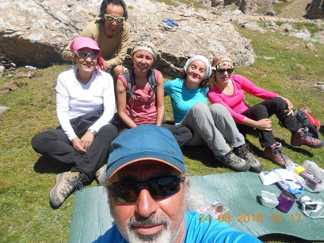 Burada “seher yemeyi” molası verdik. Hava kapalıydı ve buz gibi bir rüzgar esiyordu. Kahvaltı molasından sonra solu dağ, sağı aşağılara kadar uzayıp giden zaman zaman buza denk geldiğimiz bir çarşaktan ikinci boyuna kadar iki saatte gelebildik. Buradan sola dönerek dimdik bir rampadan yükselmeye başladık. Bir buçuk saat sonra Şahdağı buzuluna ulaştık. Buzuldan 45 dakka yürüdükten sonra zirveye yarım saatlik bir mesafe kalmıştı. Zirveye geldik. Haldır huldur fotoğraflarımızı çekildik. “Günorta yemeyi”ni orada yedik. Hava hızla kapatıyordu. Elimizdeki kazma, baton gibi metaller bulutlardaki elektrik akımına maruz kalabileceği için pançolarımızla bu metalleri sararak hızla irtifa kaybetmeye çalışıyorduk. Yağmur yakaladı yakalayacak… Gök gürültüleri… Hızla iniyoruz. Çarşak bölgenin bitiminde hava tekrar açıldı. Saat 17.00’de kamp yerimize ulaştık. Yarım saat içinde toplanarak Hınalık’a doğru, ünlü kamyonumuzla yola koyulduk.