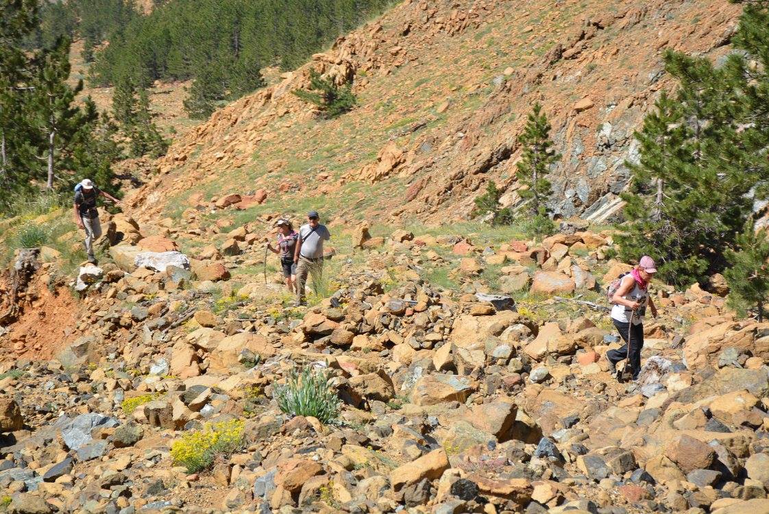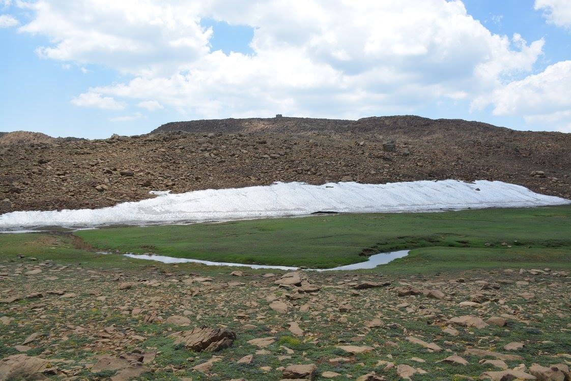Kayalardan kopan ve ufalanan taşlarla oluşmuş çarşak zeminde Özgür Aydoğan’ın liderliğinde 5.5 km’lik bir yürüyüşün ardından zirveye ulaşıyoruz. Zirvenin kuzey yönündeki tepeyi aşınca 1900 rakımlı Kartal Gölü’nü yukarıdan izlemek de mümkün. Çiçek Baba’nın taşlarla oluşturulmuş 30 metrelik mezarı da bu bölgede yer alıyor. 2295 metrelik zirvenin kuzey yamacı Haziran ayının sonunda hala kar yer yer karla kaplı.